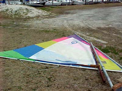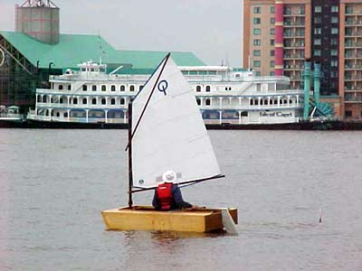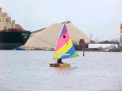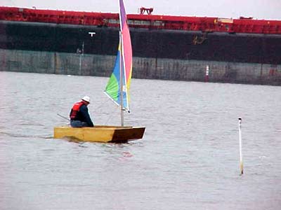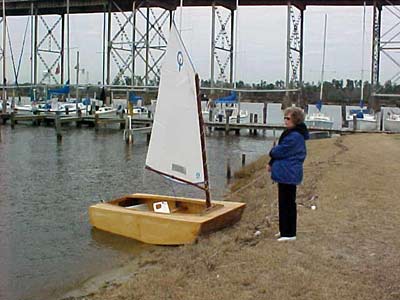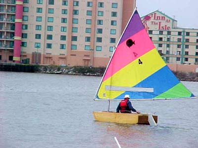 #2 - Puddle Duck Racer no. 2 (Ugly Duckling) was launched today for the first time. It is a success! This group of pictures show the Optimist International Pram sail. It is around 38 sq. ft. (about 1/2 of a Sunfish sail of 75 sq. ft.) The winds today were light, 5 to 8 maybe, and it moved along fine. It tacks and goes into the wind ok. The boat is very stable, I can sit on the rail ok, didn't need to today. (I weigh 185 lbs) The bottom flex is ok but I think I will add two rub strips on the outside botom for protection when dragging the boat on and off the trailer and for a little more stiffness. I used a Sunfish plastic board. One problem I have is the rudder, works fine but it is not kick up. I'll correct that problem though. My wife assisted me today and took pictures. She suggests another name 'Love Barge', your remember 'Love Boat'? I think I'll stay with Ugly Duckling. One of the club members came by and thought it was tiny and 'cute'.
