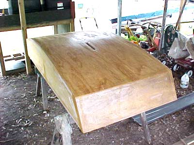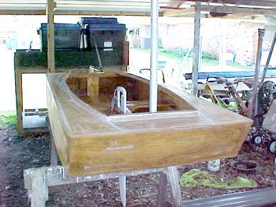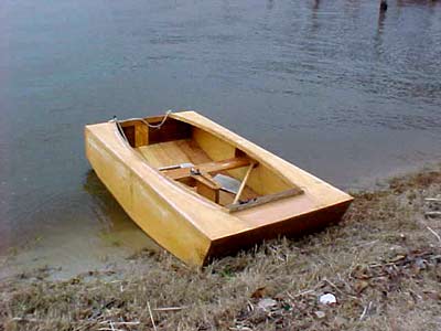 #1 - Well, here it is today. Essentally built, finishing remains. Finishing will be after I try it in the water. I used the last squirt of epoxy today, more is on the way. I used a strip of 4'' x 1/4'' plywood on the inside bottom. Helped a lot. I'll know if I need more after I try it out. Maybe this weekend. I also put a small skeg on the rear with a hole in it. It will help keep it straight when rowing and provide a tie point when trailering.