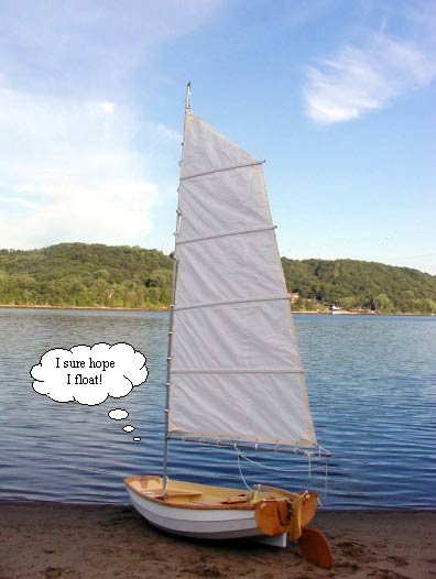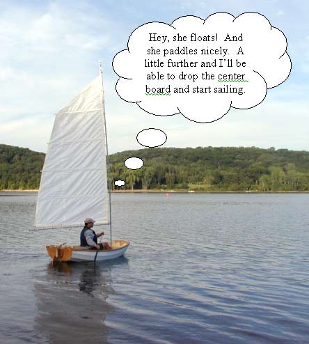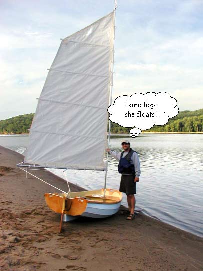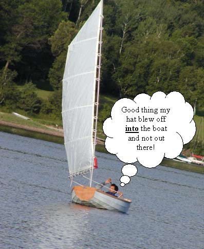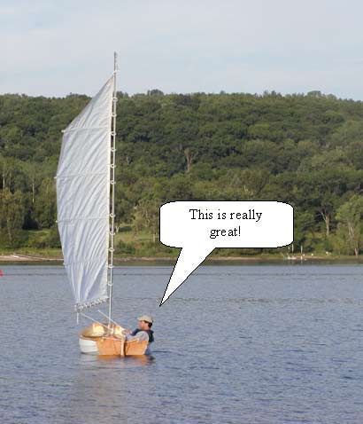 The plans called for a 39 sf standing lug rig with wooden spars. Very handsome, But, I deviated from this. The craftsmen out there might cringe at my aluminum spars. The rig includes a full-battened, almost junk-style sail made from white polytarp and white duct tape using the construction approach as taught substantially by Stevenson Projects. The sail is 61 sf, which is fine for light airs (winds under about 8 to 10 mph), but a bit much in the stronger winds that blew over the next two days. This is the first time I’ve sailed with a full-battened sail like this, but my initial impression is that I really like it. My PFD pockets are stuffed with tools, tape, etc. just in case . . .