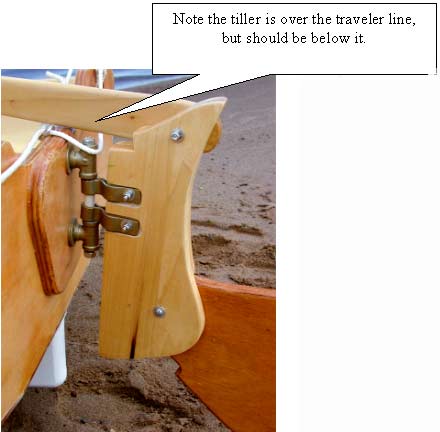 The red object that appears at the tack is not part of the rig but actually a channel marker many yards astern.