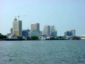 The back side of New Jersey is known for it's shallow depths and most boats heading north go outside from Cape May to the New York. Seeing as we only draw 11" we did the inside route and ran aground for the first time just south of Atlantic City. It seems the markers got on the wrong side of the boat. This is still a mystery to me how this could happen. Panic set in and I told Debbie to get out the Sea Tow card for their number. As it worked out, the bottom was only fine sand and after almost breaking my leg jumping over the stern and finding out the water was only inches deep (my days of racing deep draft sailboats told my brain to expect more) I raised the motor, pushed the boat back to the channel and proceeded on. No problem!! Shallow draft does have it's advantages! A few nights in Atlantic City and I forgot all about the grounding. We left New Jersey thru Manasquan Inlet for the required 26 mile stint in the ocean up to Sandy Hook and the Hudson River. Two things went wrong. We left Manasquan inlet on the low tide and hoped to catch the incoming to flush us up the Hudson. The low tide at Manasquan idea was good except for the 5 knot current and two inbound shrimp boats with their outriggers down. Oh, there was also several BIG standing waves entering the ocean. The first one went under the boat and the second one came in thru the front door. I had that deer in the headlights look as I watched all this beautiful green water stop back around the bed. Debbie started the clean up while I closed the front door. My normal approach to big waves is to take them on an angle and everything works fine but the shrimp boats were taking up 2/3rds of an already narrow channel and there was no escape. The boat ended up fine except that I had to replace the CD player which is located next to the front door. The ocean had a nice swell and we headed north. The wind was forecast as 10-15 out of the west but was 20 knots out of the north and that turned the ocean into a mess. We arrived behind Sandy Hook wet and very tired. The Hudson would need to wait for better weather. The next morning was glassy calm and we stayed the night across from Manhattan in Liberty Landing Marina. This would be the most expensive dockage of the whole trip but oh what a view. We toured the Statue of Liberty and Ellis Island and then took the fast ferry over to Ground Zero, the spot where the Trade Towers once stood.