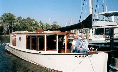 Our search for a boat began right here on the Duckworks site. I had looked the internet over for a design that would be a good choice for a coastal cruiser. I bought a set of plans from Phil Bolger for his Windermere design but didn't find the boat a good fit for us. Then our world changed. Mark Van Abbema was putting together a 39' Sharpie that only needed 11" to float and promised good speed with low horsepower. My wife, Debbie, and I were hooked! Well at least I was. We waited and watched Mark thru his web site, Markvdesigns.com, build his boat. It looked easy enough and I kept pestering Mark for a set of plans. Finally in April of 2002 the plans were ready and a trip to Ft. Myers Beach (Mark's winter home) to pick them up was arranged. It's about 800 miles from our home in the North Carolina mountains to Ft. Myers Beach but we were on on a mission. Mark took us by dingy out to his boat in the harbor (on the sand bar) and I was impressed by the good lines and ample headroom he had designed. I had lots of questions but Mark seemed to be in a hurry. I learned years later that he had thought we were the ones in a hurry and he felt bad about holding us up from getting home. He really is passionate about boats. So home we went with our dream design in our hands.
