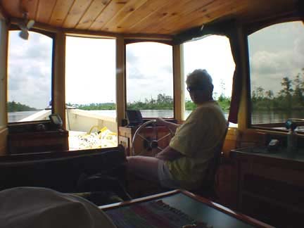 The first winter allowed us to get the interior, cabinets and water systems installed. Because we had a low ceiling with all the plastic sheeting up to keep the cold out I put the roof on last. The next summer was spent painting, sanding, sanding, and more sanding. The knotty wood interior was installed after all the wiring was in. If there is one thing that I was most surprised about it was the amount of wire in a boat. Of course I went way over on my wire sizes according to a Navy electrician that later helped me connect it all to the panels but I have never worried about the wires getting warm. Another winter was spent taking care of more details and dreaming of our soon to be true east coast cruise. The warm of Spring brought the final expense of the 60 hp Mercury outboard motor. The motor is the single biggest expense of boat building. I'm still surprised that the Mercury cost half the price of a new Honda car! I went with the Mercury instead of Yamaha because of the larger alternator and fuel injection. I'm glad I did because the fuel injection never requires pumping the ball before starting as the carbureted engines do and the extra amps helps keep the batteries up.
