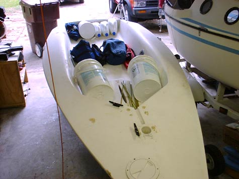 I have had several of the smaller pocket cruisers like the Potter 15, Peep Hen, Guppy 13, and are all very nice boats, just much larger than the "minimal" boat I was searching for. So I started looking for a small daysailor that had a long enough cockpit for me to lay down, and a simple enough rig that I could setup in 5 minutes. In a stroke of luck, I learned of a pile of hulls that were waiting to be destroyed at the local boyscout camp (see Shorty's article "Back from the Dead"). I rescued one which was a Holder 12. It is sort of shaped like a Laser, but it is 2 feet shorter and has a 7 foot long by 30 inch wide cockpit. Just the type of boat I was looking for, and I couldn't beat the price. The hull was completely stripped of all hardware and had several large holes in it, one big enough for me to put my entire arm into. I repaired the holes then added another layer of glass on the bottom and along the centerline from the bow for extra abrasion resistance. Sanded it down with 120 grit and painted with Walmart oil based porch and floor paint. That is some wonderful paint, if applied in light coats with a foam roller, it looks pretty good.