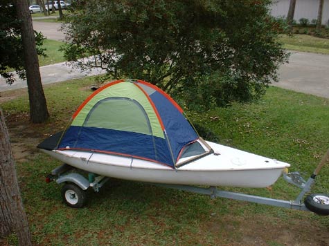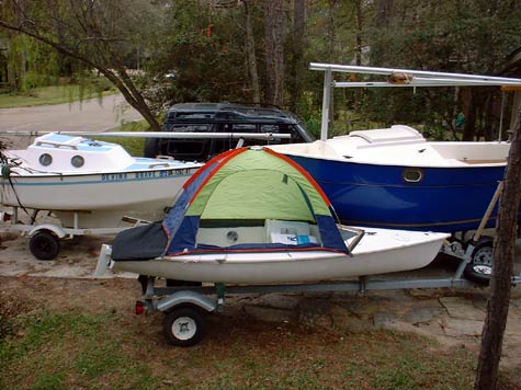 My first attempt at a minimal cruiser was a Bolger Brick. If you are not familiar with them, they are the simplest of all sailboats to build. Basically a plywood box with a curved bottom. At only 8 foot long by 4 foot wide, it would seem on paper that it is too small to do anything in, but when you build one, you become suprised at how much volume it has. So much space that I could setup a small tent inside it and lay down to sleep. The Brick has a few problems, first is the rocker. With 8 inches of rocker in that short of a water line, it really does a number on your back in the middle of the night. It also is a very slow sailing boat, and can't handle the soupy water very well, so any adventures will probably be very close to shore and in very protected waters.