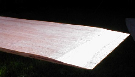 Here it is, the first piece of the plywood skin on the bottom of the boat.