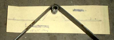 Not shown in the first picture are the pieces that fit on the boat side. The pattern was shown, though. I couldn’t show the parts before bending, because the middle bend has to come first. Otherwise you’d never get the other two bends equidistant from it. The middle bend must be bent to fit the 1” long piece of pipe. This is how I bent it to fit.