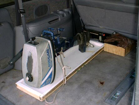 So what are some of the ways to carry an outboard? They usually are dripping oil, are covered in slime, and for the water cooled models, they leak water for a while after use. If you have a pickup truck, just toss them in the back and who cares what mess they make because that is what the bed of a pickup truck is for. For the rest of us that drive automobiles with carpet storage areas, we need to find some kind of solution to keep the mess from getting all over our interiors. Also there is the issue of whether you can lay your motor down or not. A motor expert friend of mine told me that it was OK to transport and keep 2 stroke motors in a horizontal position for long amounts of time. Thru personal experience, I have found that some motors don't seem to mind, some of my motors have laid down for several years before being used again, but one motor that I had did not like to be laid down. It was a game fisher 3.0 hp sold by Sears, not sure who originally manufactured it. If I laid that motor on it's side, it wouldn't start for atleast a half hour after being place upright again.