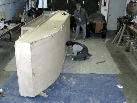 Roll her back to her feet. Install the fore and aft bulkheads at the ends of the ballast plate (which serves as nailer along the lower edge. Send the partner who’s best with a hammer forward as the up-curving bottom will crowd your swing.