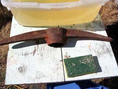 This is the picture of the pickhead after I Painted it and used rosin core solder to fill in the deep pits that were eaten away by rusting. I did not get a picture with the new pick handle made from fiberglass that will not break or be affected like wood from UV or aging. The solder I only used if the structual integrity of the item is preserved. I would not fill in anything too weak to be used properly. The solder sticks better than bondo and will not fall off.
