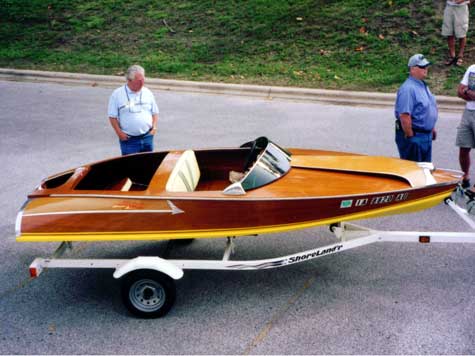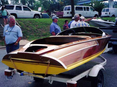 A nicely restored molded plywood Yellow Jacket boat on a restored