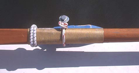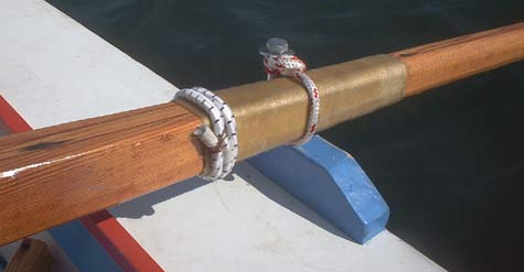 Here’s the trick that makes this all work. The first version of this had regular nylon braid rope (maybe poly) bent into two loops, stitched and seized. I found the seizing did not hold well on the stretchy rope, and over time I wound up with a frayed mess of loose seizing twine. Then I tried tying on poly rope. It stretched most inconveniently, allowing the oars to move around when pulling hard – just when you most wanted them to stay put! Use Dacron. I suppose manila or cotton would be OK too, but you’d have to be careful of rot, and you’d have to find a decent example of it. Not easy in the age of synthetics.