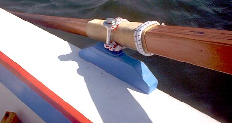 Now this will seem backward to many of you. I like to use this arrangement with the oar pulling against the rope band rather than the pin. The slight shock absorbing effect is nice when pulling hard, but even more importantly it allows the oars to trail along politely outboard of the pin when let go. This is ULTRA handy when fishing or trying to row in intermittent calms and sail during the puffs. When you’re pulling against the pin, the oars can’t do this. They try to lever against the hull and mess with the steering. This “backwards” method also allows the oars to live on the gunwale with perfect ease – out of the way, yet ready at a moment’s notice. This is what you need in a small boat. I think I read somewhere that old-time lobster fishermen did this. I’ve always had my Piccup rigged this way and I cannot imagine ever having the time to fish oars out of the cockpit and ship them. If I need the oars, I most likely need them NOW!