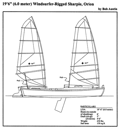 Gavin Atkin suggested I send you something about my 6-meter windsurfer-rigged cat-ketch sharpie "Orion," which I launched in the summer of '98 and have been sailing successfully on the Chesapeake and her tributaries since. Below is a line drawing. I have an Ian Oughtred Stickleback, which I've also rigged for sail, with a windsurfer mast and a 45 sq ft spritsail.