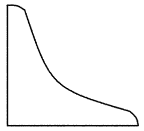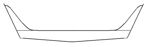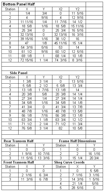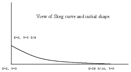 When plotting the panels, start from the lower left corner of the ply or from X and Y lines drawn on the sheets of ply. The lines in the Bottom and Side panels are the Max Beam Stations. The station for the Side panel is X=31”, X2=31 1/4” and for the bottom is X=29 5/16”, X2=29 5/16” .Mark these when laying out your panels so you can locate your frame and mold if using one. The transoms and the center mold are shown full, but the offsets are only for half of the panel. X and Y are for the bottom line and X2 and Y2 are for the top line. Join the end points with a straight line. The bow and stern transoms are shown with flat tops but any kind of shape could be cut into the ply above the shear line. The Skeg Curve Coordinates, when plotted, should follow the curve of the bottom from the point X= 28 5/16 (the lowest point of the boat) to the bottom rear of the transom. Running a straight line from X=0, Y=0 to the point X=28 5/16, Y=0 will give you a shape somewhat like the picture below. From there you can shape the bottom and end of the skeg as you please, keeping the curve intact so you can fit it to the bottom of the boat, in a slot cut out in the keel strip. The keel strip is cut on an 8? bevel to match the bottom and one piece reversed to install (see picture below).