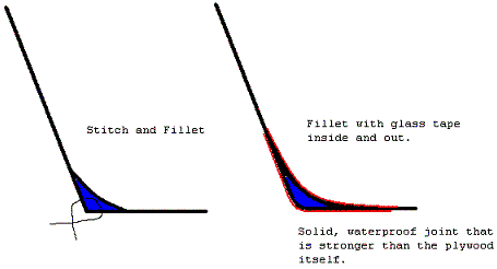 When you are ready to dive back in, now is the time to square up the boat. First of all get the transoms level. Use whatever means available to support the boat to accomplish this. Then measure from one rear transom corner to the opposite front transom corner. Measure the other side and then make them even. Recheck the transoms for level and the boat should be square, provided the panels were cut correctly. Trust your eye and look the boat over carefully, you will probably detect it if anything is wrong. If everything looks ok, now it is time to start filleting. The purpose of filleting is to spread the stresses sustained by the joint over a larger area so we want to get a good bond with the wood. Make sure you don’t fillet or glue the mold into the boat as you will need to remove it to install the frame. Leave a little gap on either side that you can fill when you fillet the frame in later.