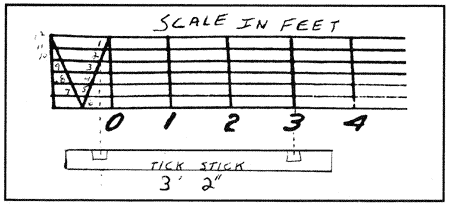 the mark on the right aligns with the largest whole inch line (scale foot) and the mark on the left falls in the "V" section. Slide the stick
