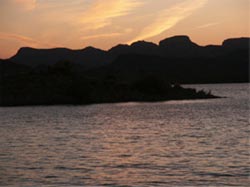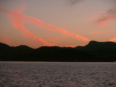 We watched the sun in the distance with its changing of colors like the changing of some royal guard. The sky began to turn a burnt orange, and the sounds of silence emerged everywhere. Like ourselves, fellow passengers now spoke only in hushed tones as God closed day as easily as we might close a door. The boat silently pierced its way through water, leaving only ripples and small crescents which rose and fell, and then fell and rose in rhythmic mystery. Memories are made of this, and so are the dreams of boats under sail in quiet waters at day's end.
