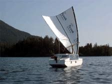 Handling our Crab Claw Rig took some getting use to, but is very simple. Hauling the tack downhaul raises the sail to more vertical attitudes, slacking allows it to recline. The leeward sheet is the ‘active’ one, hauling its limb down and in. Then the windward sheet is hardened as a stay on the upper limb. There’s no reefing, per se... just roll the sail toward horizontal, directing force upward and converting heeling moment to vertical lift. The limbs spring inwards to absorb the shock of gusts.