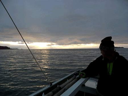 Winds range from flat calm (more often than not in the summery months) to right nasty gales. Most days have a few hours of light breezes, and often you’ll get an afternoon westerly in clear weather. The chine runners give us a good grip, though in light winds we have to induce heel with crew weight. We made it a rule to close the leeward oarport covers, and would often leave both oars angled up and out the open windward ones.