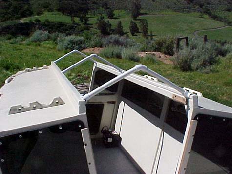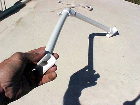 With the recent increase in "slot top" cabin boat construction there seems to be more and more inquiries about how to cover that open slot against the elements. Hard covers present the challenge of design, construction, fitting, securing and storage. Way too much thinking and work for me. Soft covers offer a cheap, easy solution. A small section of any waterproof tarp will do. Heck you can even buy a new polytarp large enough to cover the slot for less than $10. OK, so you have a tarp, you cut it to size (make it much wider than the slot, best to make it nearly as wide as the cabintop to keep rain from blowing under it), and you have grommets installed around the tarp perimeter. Now you need to make some suitable attachments like eye pads (or a handrail) to the outer edge of the cabintop. Might as well make these substantial enough to use as tie downs for oars, boom, mast or whatever you might want to lash to the cabintop when spending some time at anchor. When aboard, run small line from the tarp grommets outboard to the eye pads and back under the tarp into the cabin so you can stretch the tarp tight from inside the cabin. Now all is well until it rains and your tarp sags from the weight of the water it collects... Here's an easy solution to that problem... good old 1/2" pvc pipe and fittings. Cut the top off of some T's and glue them to some pipe with a 45 degree elbow in between and you'll have some pressure fit rafters for just a few cents each.. Easier to describe these with photos than words so look here.
