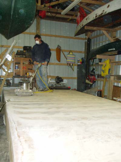 I thought I would give an update on my Lisa B Good project that has been going kind of slow.I didn't get time to work on the boat over the winter but I started up again this month. I have the sides glassed and I will be applying the glass on the bottom this week.I enclosed a photo of me sanding the boat with my 1.5 horse buffer and a 80 grit sanding screen.It sure makes short work of prepping the bottom for the glass.I had the entire bottom sanded in about 15 minutes.I plan on coating the bottom and up to the waterline with epoxy and graphite.I have had a few people email me to see how it was going so I thought I would send you an update.