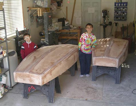 Here’s a photo of my boys’ Mouse boat projects just as we were finishing the hulls, with the skippers, Evan and Elliot admiring their handiwork. The boys did much of the layout, panel-cutting, stitching and epoxy/fiberglass work. All with careful supervision, of course. I seem to get stuck with most of the sanding.