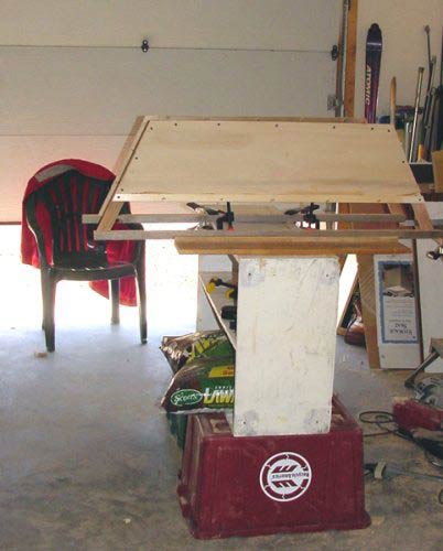 The main point of this email is to send along a pic of the card model and another pic showing the RR12 project at it's beginnings. Just the two center seat forming sections mounted in tandem on a strongback which is actually an old bookcase set on it's side and raised off the floor by the recyling tubs. The sides (not shown) are almost ready to attach to these pieces. After that it's going to start looking like a boat very quickly.