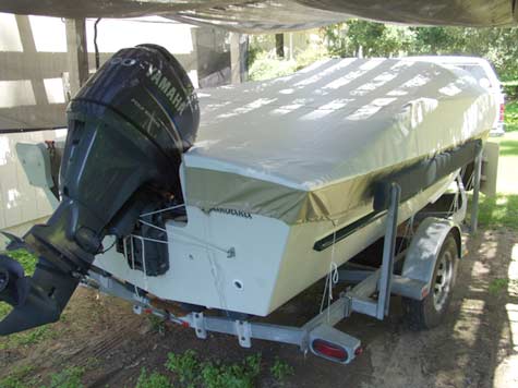 I'm on the way to the store.... and I just solved one of skiff-boating's biggest problems: a fitted cover that allows road travel AND quick set up when at your destination...pix to follow.....well worth the $750