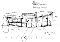 Hull shape has plenty of shape : strong flare, a springy sheer, and sides that twist as they run forward to the stem. A robust stem protects the edges of the plywood and impart a traditional appereance, as do the decorative sheerstrakes added along the upper edges of the side panels