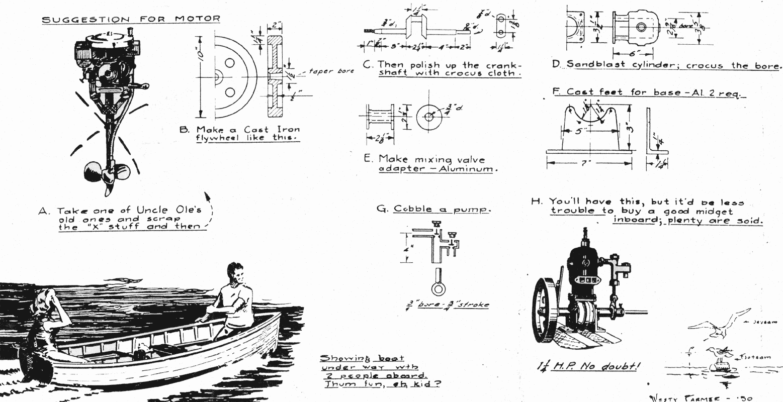 carcass, can be rejuvenated for about ten bucks to make a good, easy starting, low pressure inboard. The secret is in a bigger flywheel, which is easy to cast, in getting plenty of grease to