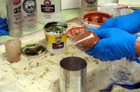 Before I mix up my fillet material, I get out my old tin can and put a used plastic bag inside. Use the ones with no pleats in the corners. You only want one of the corners in the can, so I put my finger in the corner to hold it in place as I fold the excess bag around the outside of the can. Now I pour in the fillet material by scraping the side of the cup as I rotate it in my hand; like a cement truck pours out it's load. Have and old rag handy to wipe off the popsicle stick and the inside of the cup. Both can be reused several times. Pull up the sides of the plastic bag and twist it tight up to the fillet material. Slide down a knot next to the fillet material and cut off the excess bag with some old scissors. I go to the dollar store and buy a new pair for every boat I build and throw them away when I'm finished. The scissors are usually finished too. Take the scissors and cut a "SMALL" hole in the end of the bag. You are now ready to jump stitch.