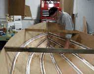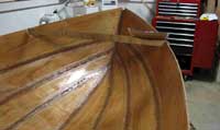 As a side note, I had gotten to the wet out of the 2" tape when I called it quits (7pm) for the day. I wanted to eat and "Lost" would be coming on soon. That forced me to wet the seams again the next day before applying the 3" tape. I used more epoxy than I would have normally if I had placed the 3" tape on the wet 2" tape and did a finial wetting out of everything. If I had thought about how long it would actually take to fillet and tape the hull, I would have pulled the wires and bolts and only wetted out the seam areas for the fillet material and call it a day. Then do the fillets and taping the next day. With System Three Silvertip Epoxy, you can wait up to 72 hours between applications without having to sand, and still have a good chemical bond. Also in my haste to see what the "others" were up to, I didn't check the seam areas for runs, and had a couple of small ones. A "cabinet scraper" took care of them and I then proceeded to give the inside of the hull a first coat of epoxy between the seams to seal off the grain. Much easier now before all the interior parts go in. I'm using a "rubber edged" squeegee to do this with. I used a brush on my first boats and couldn't keep the runs from ruining my finish. Then I went to the plastic squeegee and that helped some, but I was still using more epoxy than was needed. The "rubber" squeegee scrapes it down to the surface of the wood and spreads a tiny amount of epoxy around farther that you can imagine. I do a finial scrape with the rubber squeegee when I wet out glass cloth and am amazed at how much it can still find to move around.
