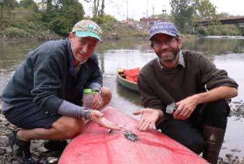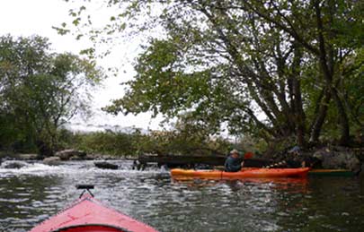We finished surfing around under the old bridge, and then passed the floating dock behind the train station where most afternoons I went by a couple of retired guys, Gene and Robert, would be fishing, but not today. Next up was another weir. I always made a short portage in my skin boat, but Peter and Rodman had plastic boats and decided to run a chute over by the left bank. Peter came through fine, but Rodman hung up on something about halfway down, and a minute after he was through the chute, he was bailing like crazy.