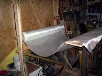 I bought fiberglass in a 110-yard roll, and needed to cut it into three-inch strips for the seams. I have a leg vise on a portable stand that I can move around the shop. PHOTO I attached a piece of 1” scrap to the bottom of a 1’x3’ piece of hard board, like the stuff counter top is made from, and drew a line down the hard board, three inches from the edge. PHOTO I made a stand from some more scraps 1” material for the fiberglass roll and pulled the glass off the roll onto the stand. We would cut several strips of fiberglass and then epoxy them. For the epoxy, I took a scrap of plywood, attached 1” scrap all around with sheet rock screws and used that to wet out the strips. PHOTO We made sort of a production line, one person cutting, another person wetting out the glass strip and my wife and I applying them to the seams. After we had filleted and glassed all the seams on the inside, we flipped the hull and went to work on the outside.