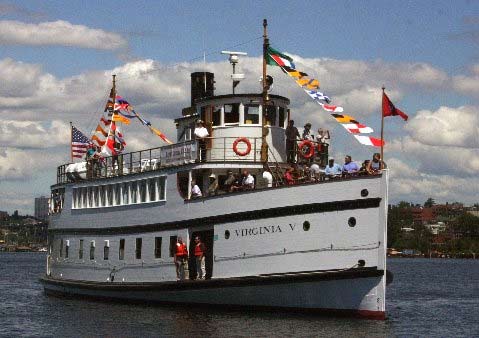 the ferry VIRGINIA V and one of the Center's two sharpies