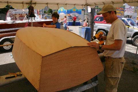 a family boatbuilding event ongoing under tents near