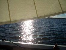 After about an hour, the wind had picked up to the point where the motor was no longer needed. After it was shut down, the couple were left with the bewitching sounds of sailing in a wooden boat – the lapping of water under the leeward chine, the tapping of reefing nettles on the taut sailcloth, and the faint gurgle of water as it ran aft past the stern transom. |