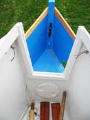 I think designer Jim Michalak originally drew this boat to have a nearly full length slot top, and for good reason. Jim is entirely right when he comments on the convenience of being able to easily walk forward and over the bow to dry land. Eric for some reason preferred a smaller opening, and left about 20” of deck in front of the slot before the bulkhead. This makes docking by the bow rather clumsy, and some degree of athleticism is needed to scramble to the beach. I think I remember Eric being taller than me, so that might be part of it.