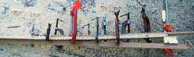 But before laminating I had to figure out how much curvature was needed. This only requires a straightedge and a tape measure. With the straightedge flat against the side of the cabin, measure the distance between the straightedge and the stempost.