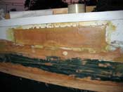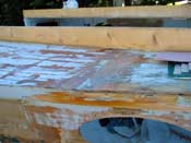 I did draw lines on the hull after initial fitting, though, so I could drill pilot holes from the outside of the boat. That way I couldn’t miss the wale. Once the glue cured, I removed the old wales. This is easiest if you cut a lot of kerfs with a circular saw and chisel out the waste. Be sure to cut a LOT of kerfs, though, or the wales’ grain can split right down into the plywood. I had to fill a couple holes because I got lazy with this. The belt sander takes off the last bit, down to clean wood.