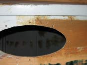 After curing hard, it’s time to cut holes for new ports. The new ports are four 13 x 6.75” elliptical pieces of 1/8” plexiglass. You might need stronger material for a sailboat, but it is not too likely a powerboat will end up on its side too often.