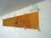 Still, we need some reinforcement for these stitched joints. PL400 is quite weak in shear and the copper staples represent most of the strength. They are probably adequate, but to prevent future cracking along these joints, fiberglass and epoxy is a wise addition. But in the spirit of el-cheapo experimentation, I did the starboard side with epoxy, and the port with PL400, 6 oz fiberglass in both cases.