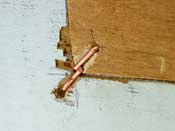 Filling the holes required cutting plywood to fit the gap. I stitched it into place with copper wire pulled out of old scraps of Romex. But I didn’t twist them like in normal stitch and tape. Instead I just made a “staple” so I could hammer the wire down flush with the surface of the plywood. This is a lot easier if you cut channels with a chisel or knife. An angle grinder makes really short work of it.