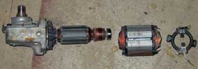 Above are the parts of the DeWalt grinder, left to right: gearbox and bearing attached to armature; field coils that fit around armature; brush assembly that contacts the commutator (the skinny part of the armature).