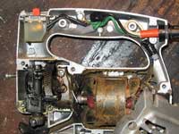 The DeWalt angle grinder was an interesting case. Greg had a jug of glue tip over on a high shelf. The angle grinder got glue through the vents and the motor was immobilized. I didn’t take “before” pictures because I hadn’t yet realized this topic would be an article. Suffice it to say that getting it all out required a complete disassembly and several hours of very careful work with a chisel and chip carving knife. Good thing it wasn’t epoxy! Here’s a photo of the brush assembly where you can see a little of the remaining glue inside the case.