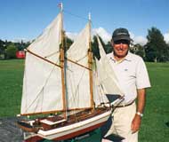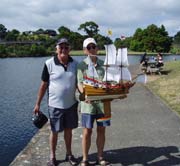 It was nice to finally meet our Publisher, Chuck, and his wife Sandra when they visited New Zealand in late January this year. They visited our sailing pond, Onepoto and met a few of our Ancient Mariners. Why we even got Chuck to have a go (his first ever!) at RC model sailboating, photographic evidence in the top left image. In the top right photograph is the old New Zealand scow Herald built in 1898. In 1928 she hit Canoe Rock in Auckland’s Hauraki Gulf and without a crew sailed away never to be seen again. Not so really, for old fishermen in the dead of night swore that they had nearly been run down by an eerie old scow with no sign of anyone on board and that is the legend of Herald. New Zealand trading scows make wonderful subjects for sailing models, one of the nicest (seen in the above photograph with Murray White) being his Alma occasionally sailed with the Ancient Mariners in Auckland.