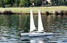 Someone I met many many years ago in Plymouth, Montserrat in the Caribbean Leewards island group had a weird cross-eyed cat that I clearly remember, but I have to admit that I had never heard of a catamaran with a rig consisting of a mast on or closely situated to each hull. That was until Auckland Ancient Mariner, Alexander Bartlett produced this RC model version. Multihull followers may well be aware of the concept. Alex, known for his fine  ketches and schooners wanted to build something `different’ and after talking to well known kiwi yacht designer, Jim Young  he decided to base the model on one of Jim’s `Typhoon’ hull designs, then go non-conventional with regard to mast placement ie a mast on each hull.