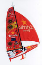 Ron Rule, an Auckland Ancient Mariner model sailor, started off by drawing a triangle on a scrap of paper then this rather stunning little Footy-sized model (above left) resulted. It goes well enough too but it is too early to know how fast it may be.  A few weeks after I had seen it, I received a release from Estrella Damm, the Spanish Brewery, advising that their red dart-like IMOCA Open 60 (seen above right) had won its first race on August 8th (The Artemis Challenge) run as part of Skandia Cowes Week. Each of seven boats were racing for a charity, Estrella Damm with a crew of seven for Africa Viva, a charity based in Barcelona  working on development programmes in Western Africa. Now Ron’s Footy is not disimilar the Open 60 in appearance is it?