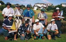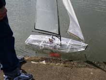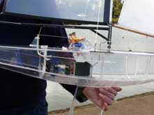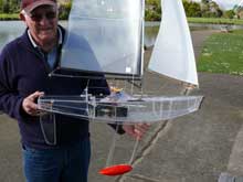 Always prepared to`push the barriers’ is New Zealand’s Ron Rule, one of Auckland’s Ancient Mariners. Ever eager to experiment, his latest model was a Starlet in style totally `see through’ yacht with frames of 5mm Perspex, sides, bottom and deck of 2mm Perspex. Now I have to tell you that the boat though heavier than the average Starlets sailed in the Auckland fleet sailed unbelievably well, looked exciting and drew huge attention at the Onepoto pond just over the Auckland harbour bridge on the north shore side. It was only a matter of time (days in fact !) before the appropriately named Sea Thru which I photographed (above) when launched)was hit broadside by another Starlet, resulting in a cracked hull. Not that it sank but it somewhat spoiled its appearance if looked at from the starboard side. Built by the unflappable Ron, it has long been fixed.